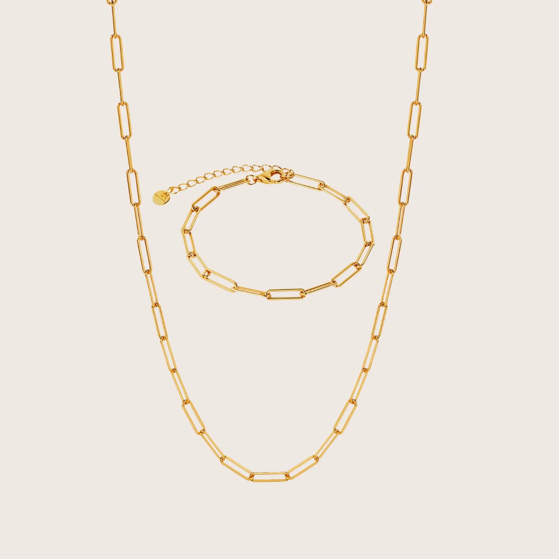 Sleek paperclip necklace + bracelet for modern minimalism with lasting shine.