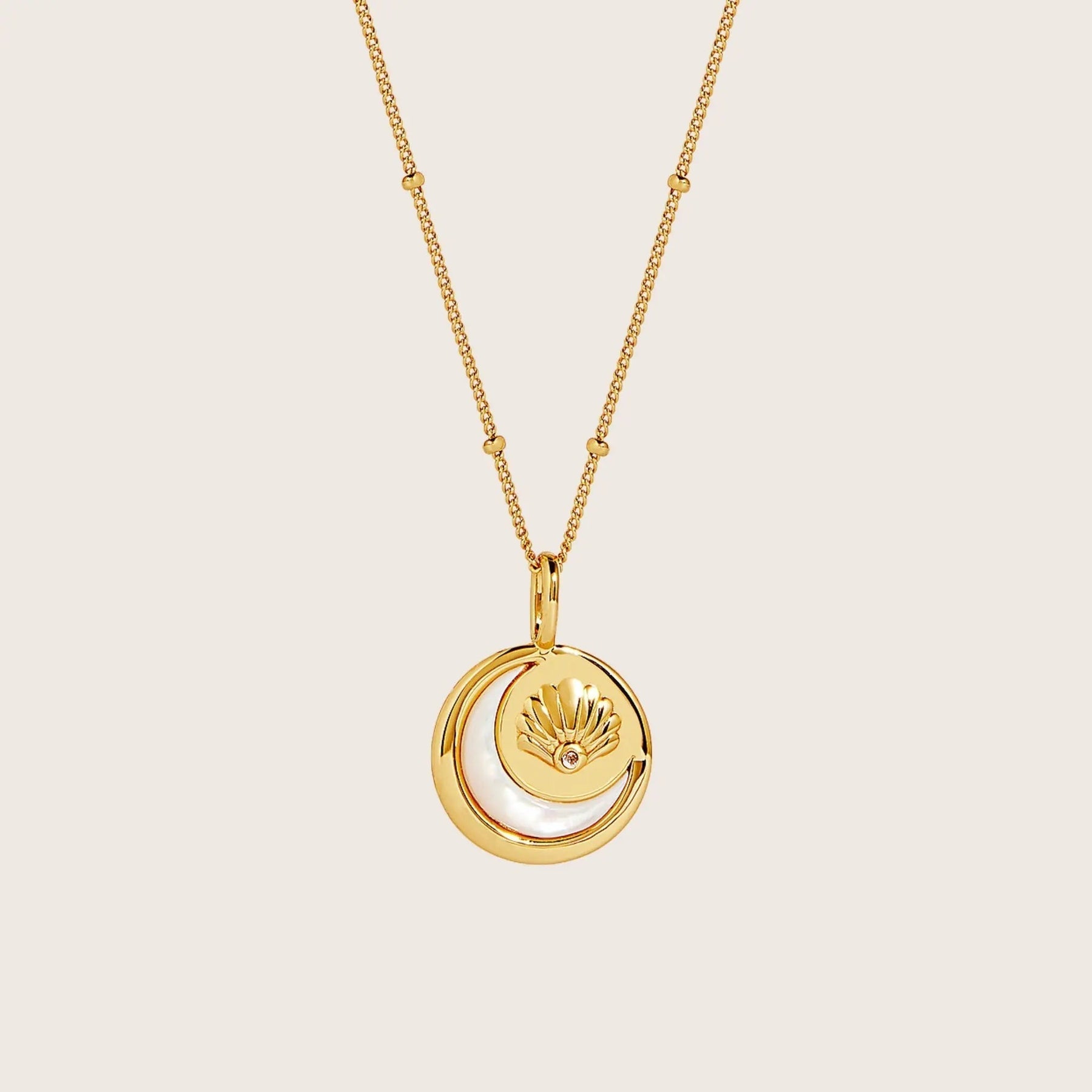 - Raised shell motif featuring a Mother of Pearl crescent moon with a soft light pink morganite accent.