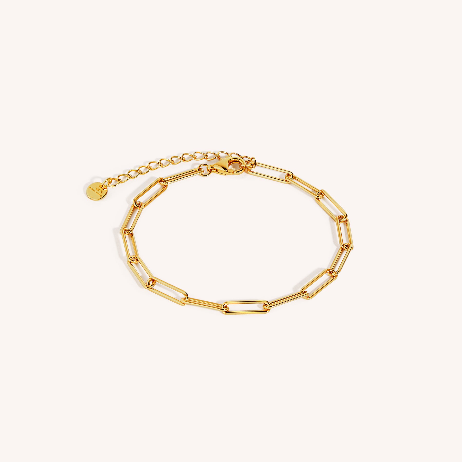 An 18K gold vermeil Rebekka paperclip bracelet with a length of 16 cm + 4 cm extension, featuring chain links and a stamped 18K gold vermeil marking.